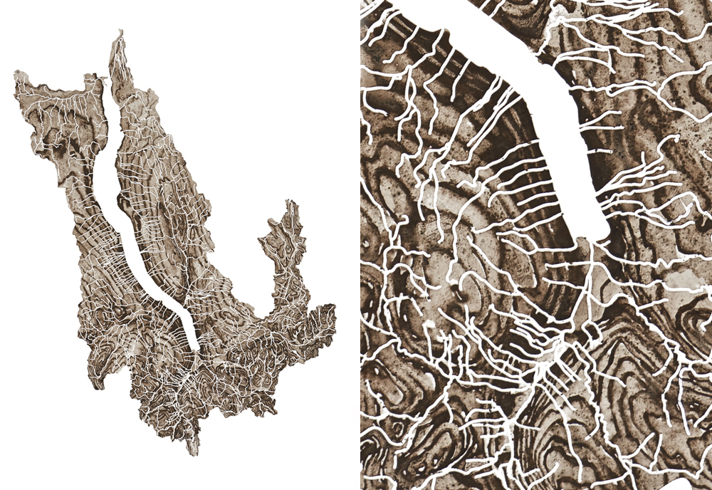 Seneca Lake, 2017 / 29″ x 21″ / ground rock, water, & gum arabic on paper (detail on right)