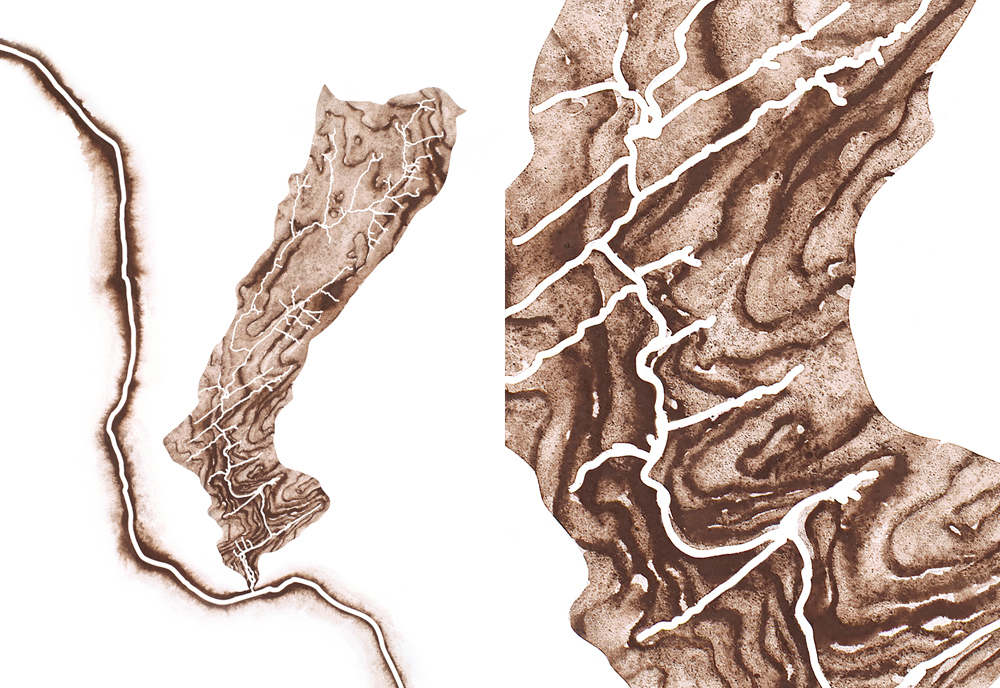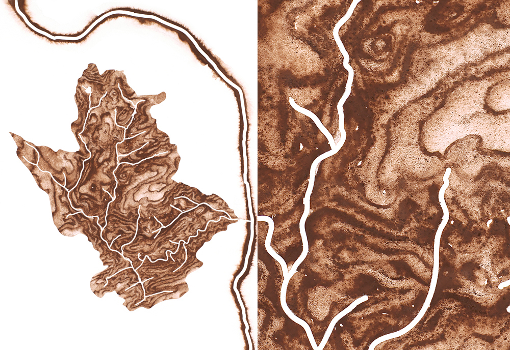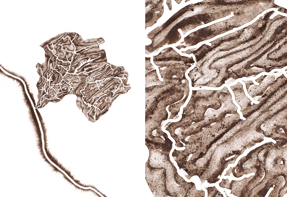 Nishisakawick Creek, 2017 / 15″ x 11″ / ground rock, water, & gum arabic on paper (detail on right)